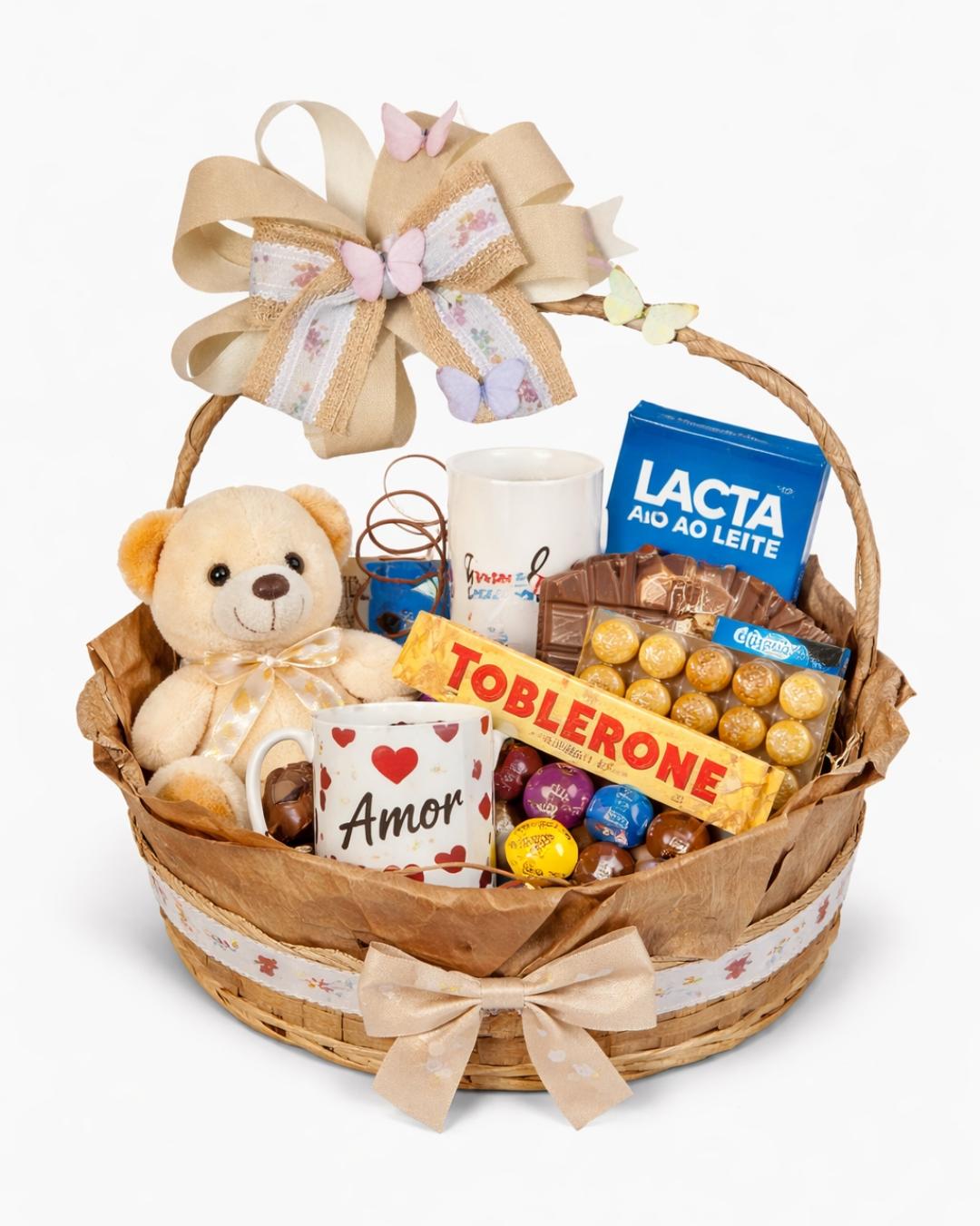 Cesta bem montada, com todos os itens visíveis e organizados, criando um visual cheio e encantador logo no primeiro olhar.