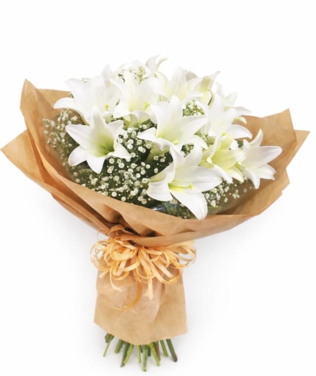 Encante com a elegância dos lírios brancos, um buquê delicado e sofisticado que transmite paz, carinho e admiração. 💐✨