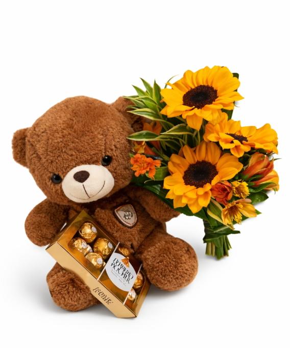 Perfeito para surpreender com um toque especial, combinando a energia dos girassóis com a fofura do ursinho e o sabor dos chocolates.