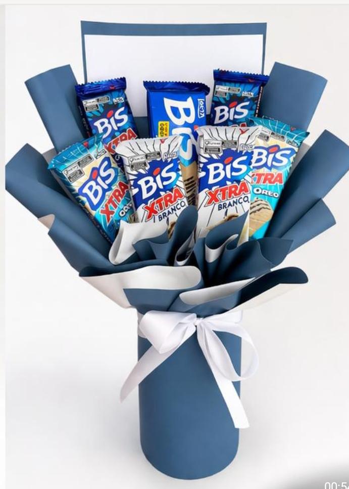 Este lindo buquê é composto por chocolates BIS em uma montagem sofisticada, com acabamento em tons de azul e laço delicado, trazendo um visual elegante e diferenciado.