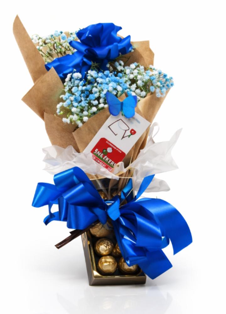 Este lindo arranjo combina a suavidade das flores em tons de azul com a elegância de chocolates finos, criando uma experiência única e cheia de carinho.