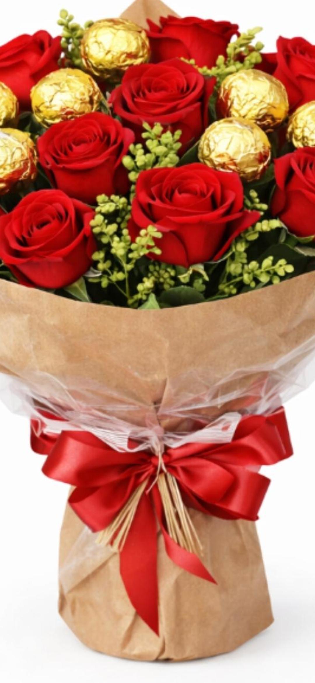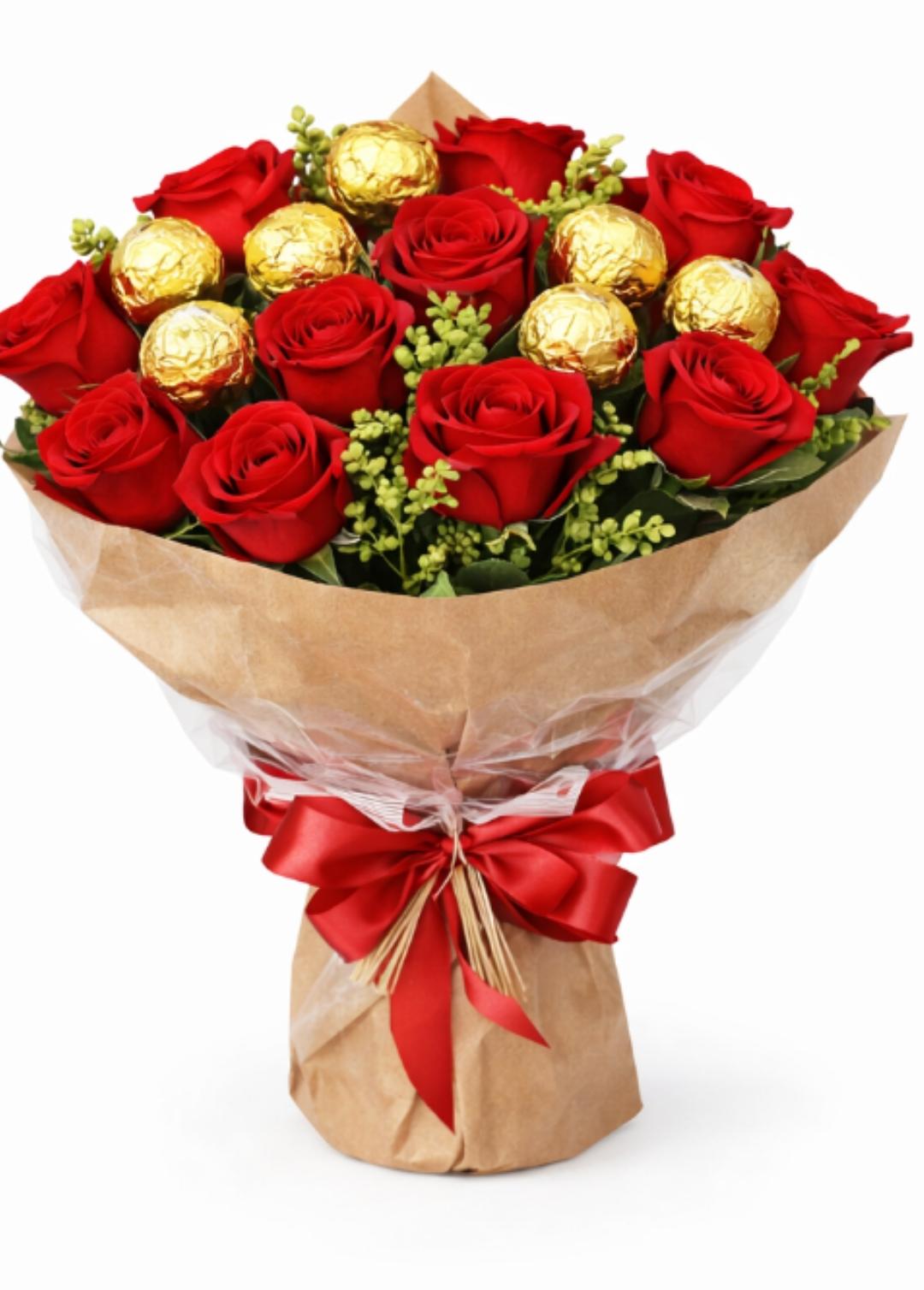 Um buquê irresistível que une a beleza clássica das 12 rosas vermelhas com a sofisticação de 8 bombons Ferrero Rocher, delicadamente distribuídos entre as flores.