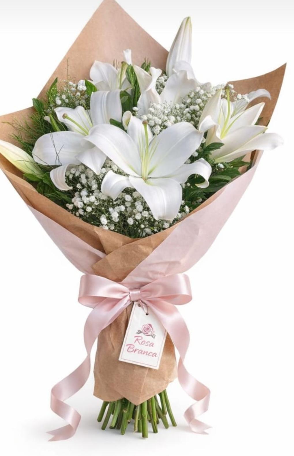 Encante com a elegância dos lírios brancos, um buquê delicado e sofisticado que transmite paz, carinho e admiração. 💐✨