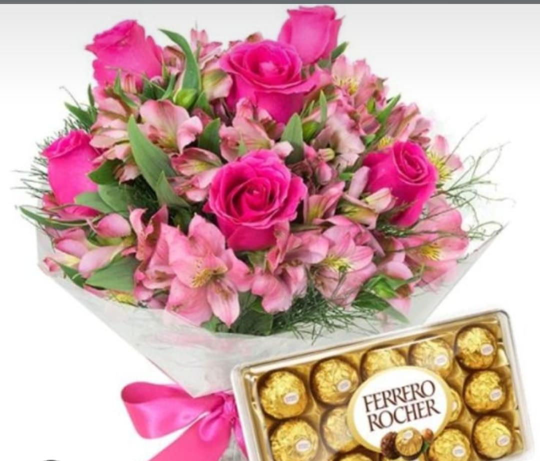 buque com 6 rosas pink nacionais astromelias rosas arranjo delicado e de uma beleza sem igual. acompanhando caixinha com 12 bombons ferreiro,doçura e beleza.