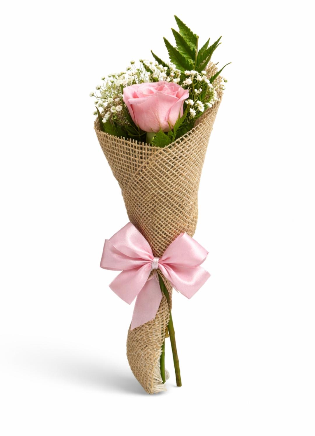 Delicado e cheio de charme, este mini buquê é composto por 1 rosa acompanhada de mosquitinho branco e folhagens naturais, criando uma combinação leve e elegante.